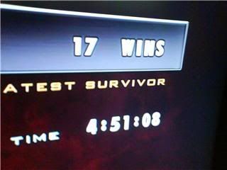 I have beaten my record yet again: http://i253.photobucket.com/albums/hh51/jonhou/tekken32.jpg Hwoarang in survival 32 wins. |